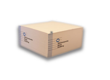 Omschrijving: Notitieblokje van 10x10 cm met 80 grs papier, aan vier zijden bedrukt in twee kleuren.